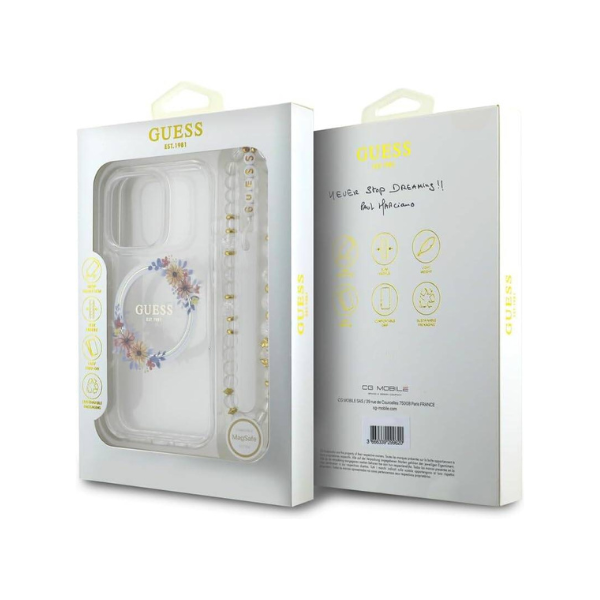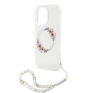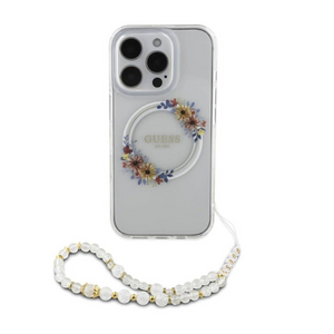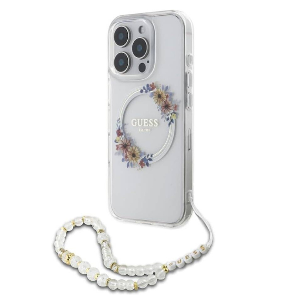 Coque Guess IML Flowers pour iPhone 16 Pro – Design floral translucide avec sangle en perles et compatibilité MagSafe
