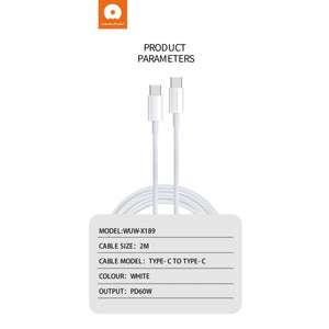 Le câble WUW X189 de 2 mètres offre une charge rapide jusqu’à 60W et un transfert de données efficace entre appareils Type-C. Conçu pour optimiser la recharge des smartphones, tablettes et autres dispositifs compatibles, il garantit une alimentation rapide lorsque les normes de charge rapide sont prises en charge. Sa longueur généreuse facilite l’utilisation tout en assurant une connexion stable et performante, faisant de ce câble un accessoire essentiel pour une expérience de charge et de transfert fiable et rapide.